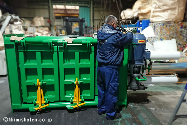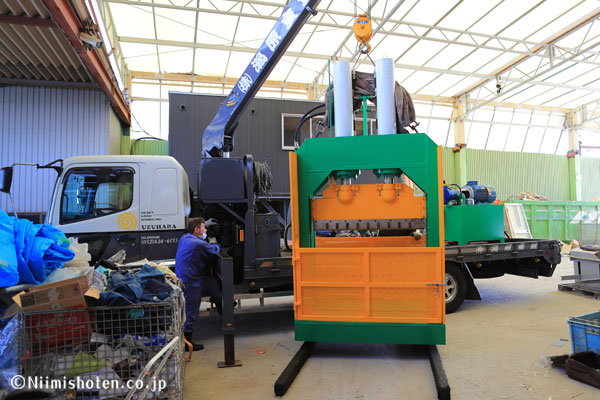 この写真は、納品先にてギロチン君の荷卸しをしている様子です。基本的にはクレーンを使用しておろしますので、クレーン車が入れるスペースの確保が必要になります。