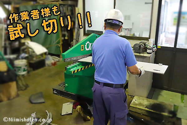 また、担当者様曰く、予想以上の切断力だったらしく、試し切りを行ってる間に、途中からは担当者さまが自ら切断を行っていました!!