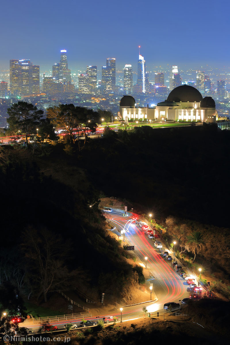 縦位置で撮影をして、グリフィス天文台に向かう車のライト等も構図にいれてみました。